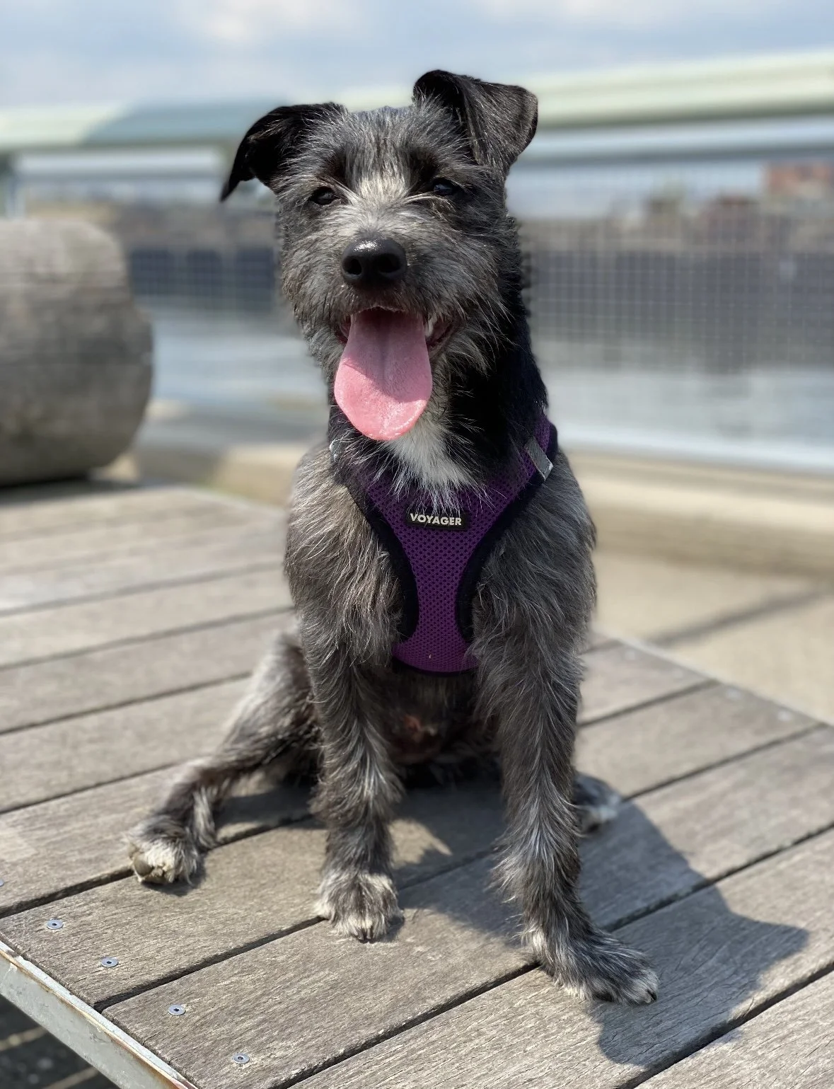 Details: Billie is a 20lb black and gray terrier mix. She is friendly, but very skittish. She is wearing a teal colored harness with an ID tag.