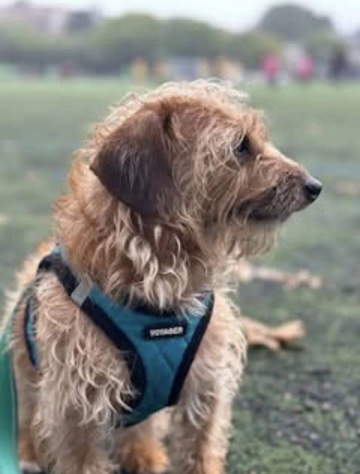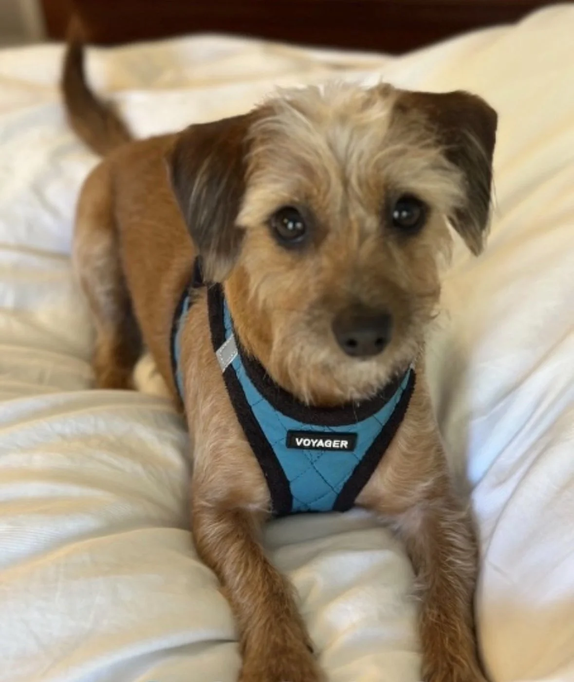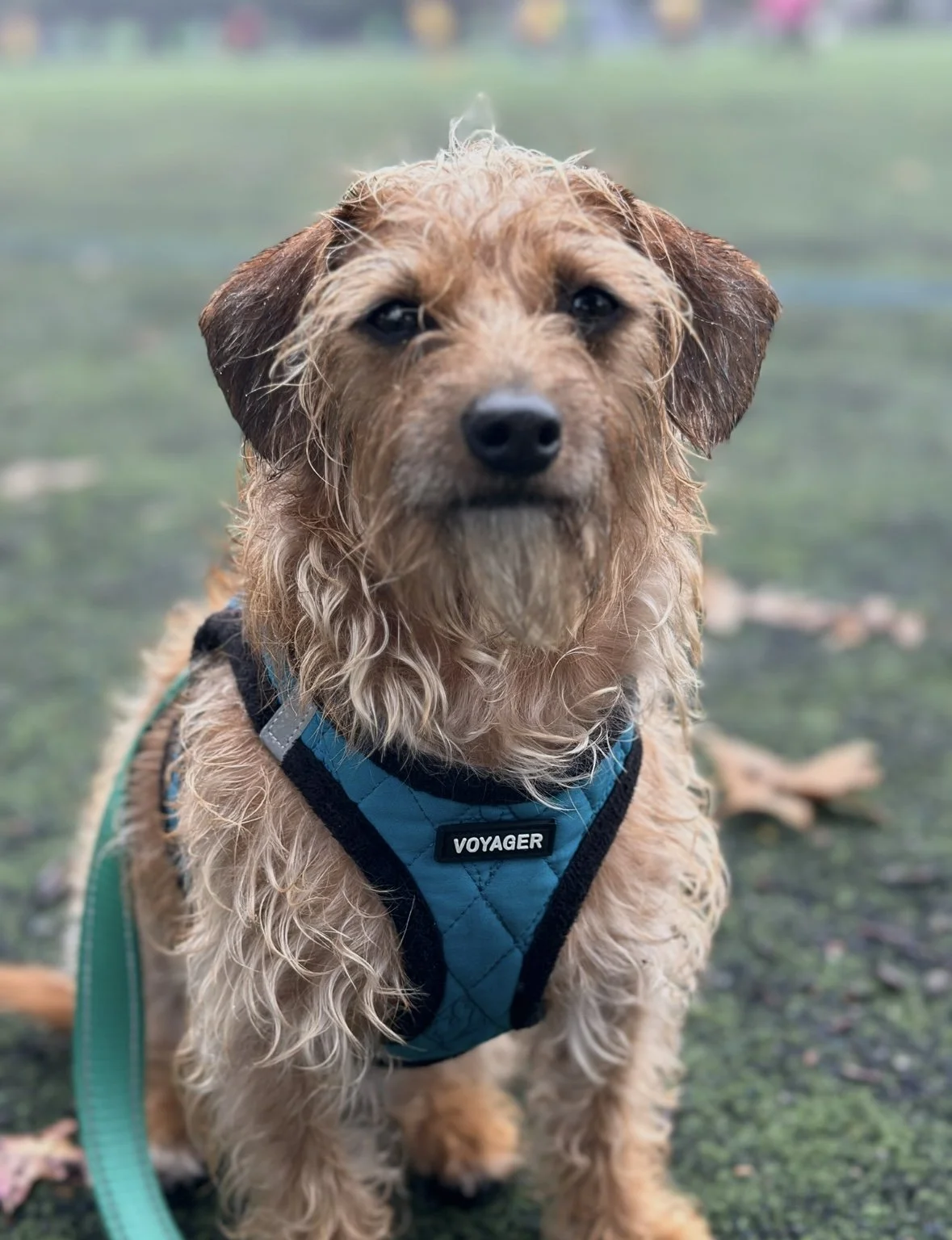 Details: Leona is a small Jack Russell, Poodle-mix weighing about. 12lbs. She has scruffy brown/reddish hair and a white stripe on top of her head. Leona was last seen wearing a bluish green Voyager harness. Same as in the photos. She most likely would have gotten out of it by now.