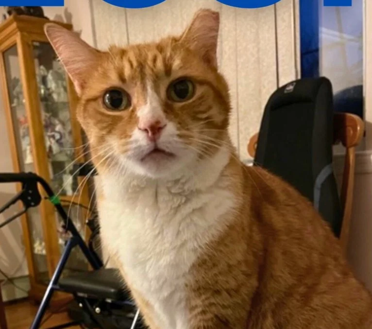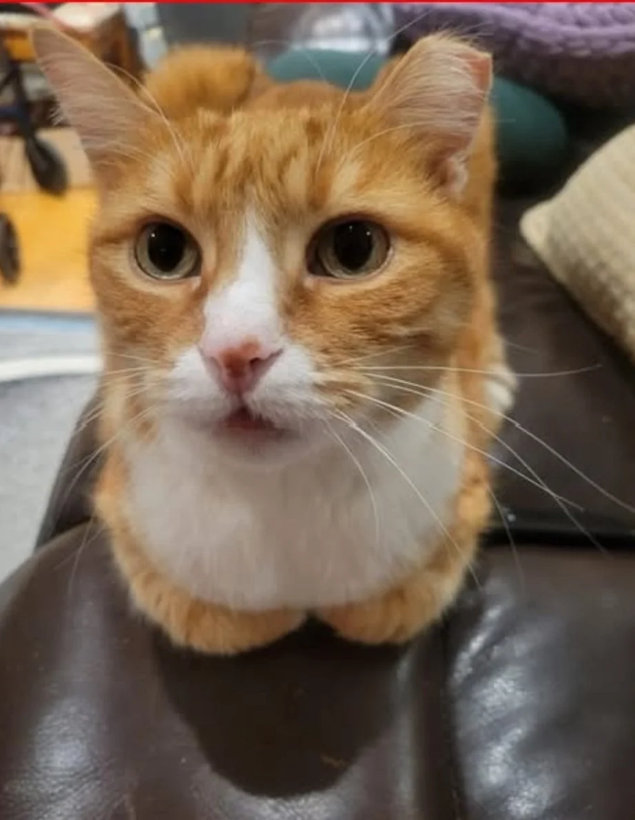 Details: Neutered yellow tabby cat with freckles on his nose and clipped left ear. Very sweet.